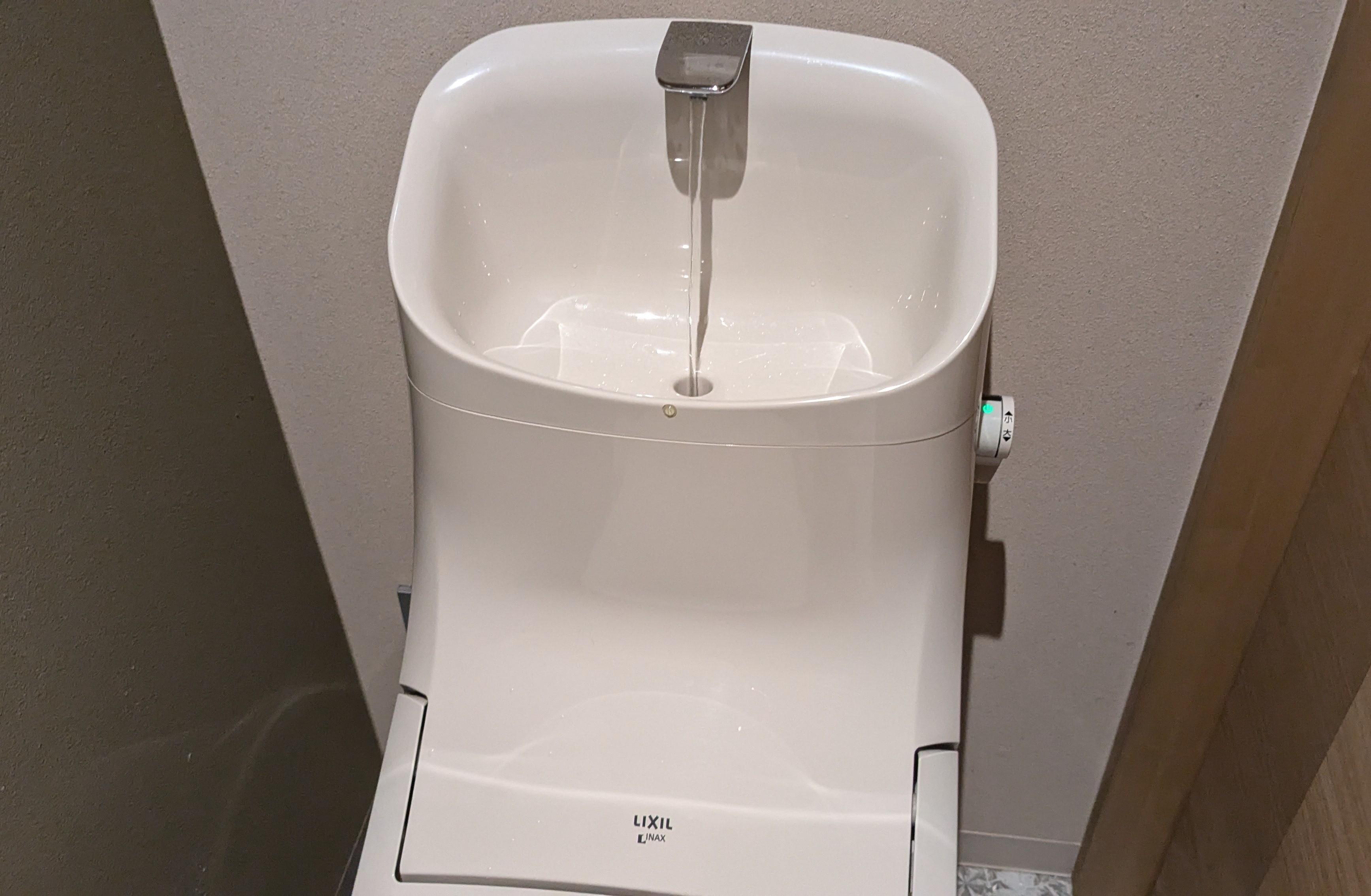 Toilet installed with a small sink that dispenses reusable water after a flush to keep your hands clean.